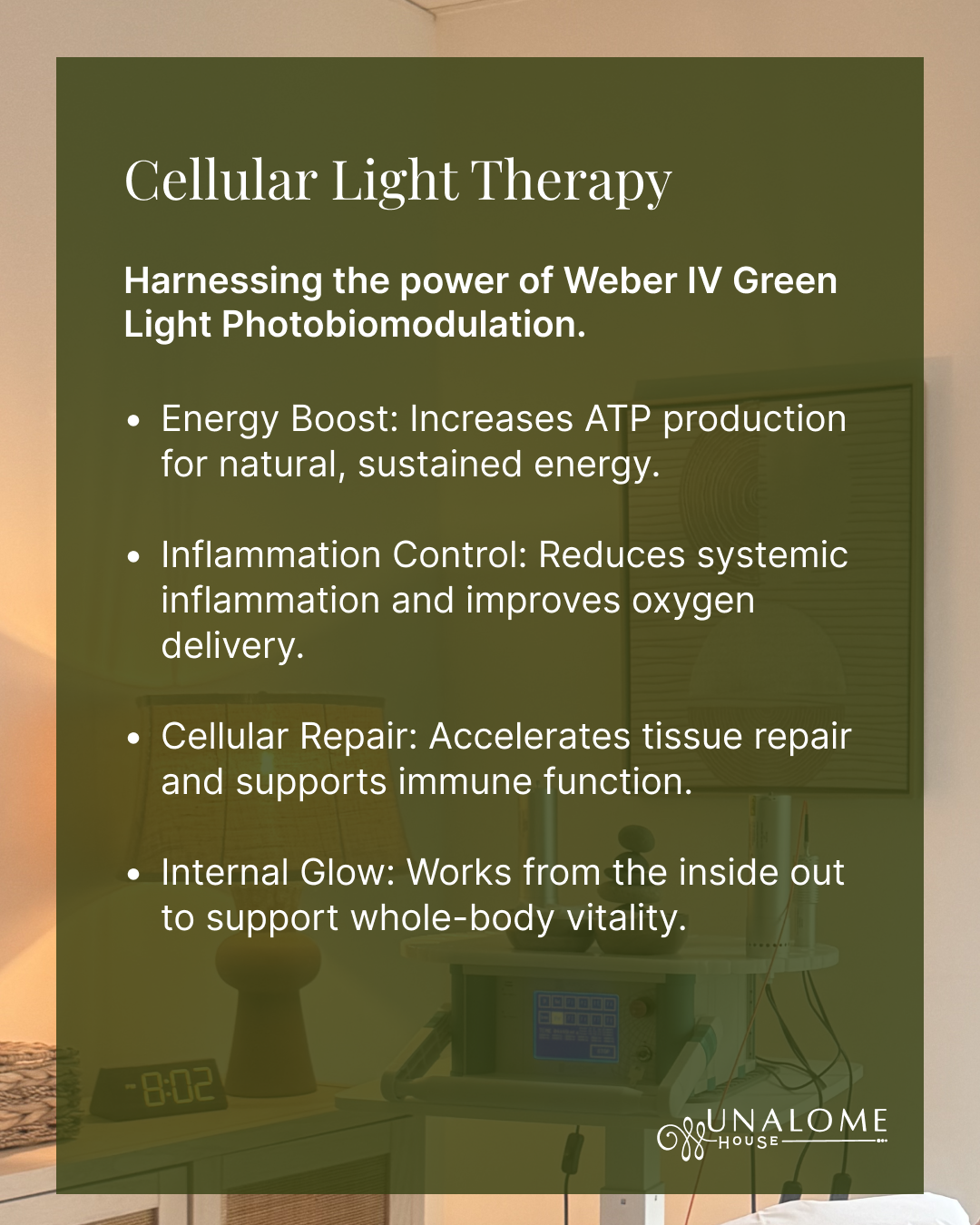 This elevated treatment pairs Nutrient Replenishment IV therapy with Weber IV Green Light Photobiomodulation, an advanced cellular therapy that works at the mitochondrial level to enhance energy production, improve oxygen delivery, and support the body’s natural repair processes.