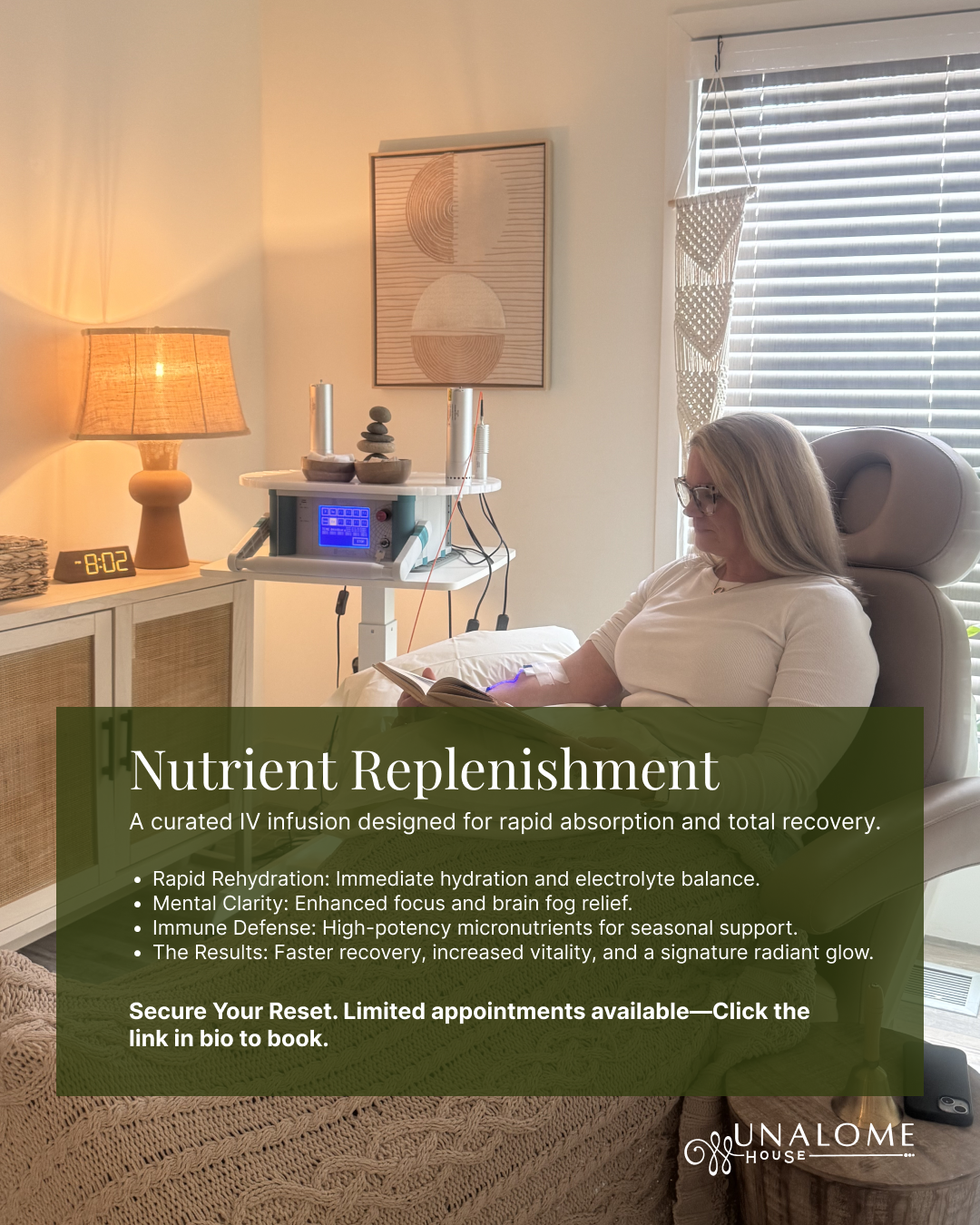 Each session is delivered in a calm, restorative setting designed to promote deep relaxation while your body receives targeted nutritional and cellular support.
